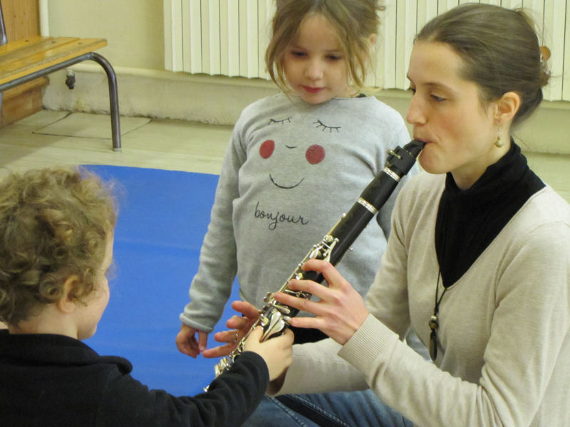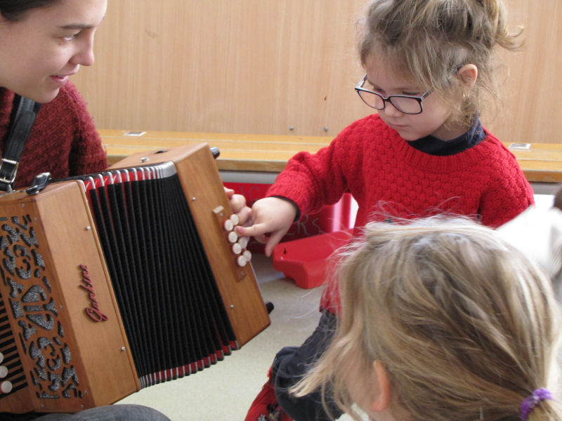 Ces ateliers ont eu lieu en Janvier-Février 2017 et ont été conçus par deux membres de l'équipe organisatrice de la Nuit du Folk du Royans, en lien avec l'enseignante. Lors de l'atelier musique, la participation de plusieurs musiciennes a permis de faire découvrir différents instruments aux enfants : violon, accordéons, flûte traversière et clarinette.