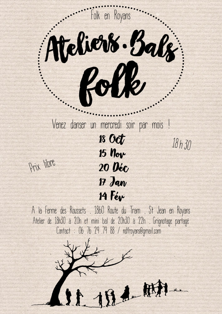 L'association Folk en Royans vous propose un atelier par mois à la ferme des Roussets, ouvert à tou·te·s. Au programme, de la danse, bien sûr, collective, seul·e ou en couple, mais aussi un échauffement et des exercices pour explorer le guidage et le suivage, la relation à l'autre et au groupe, la connexion... Ces ateliers seront suivis d'un mini-bal afin de pratiquer et découvrir de nouvelles danses.